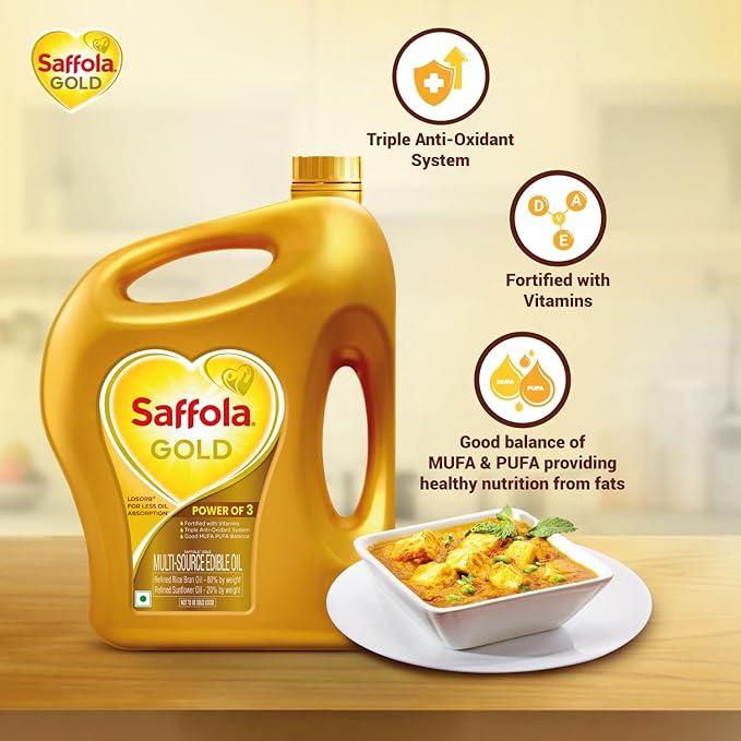 5 Litre Jar + 1L Pouch Saffola Gold Refined Cooking oil | Power of 3 - Balance of Good Fats, Triple Anti-Oxidant System & Fortified with Vitamins | Multi-Source Edible Rice Bran & Sunflower Oil |