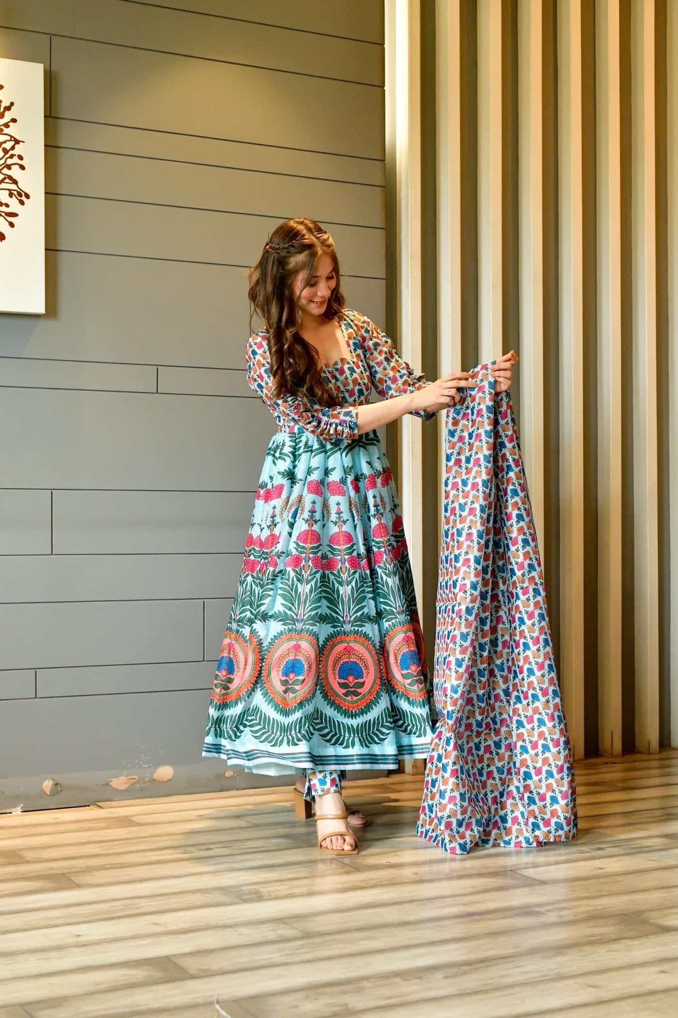 Light, bright, and full of life, this suit set will make a delightful addition to your wardrobe. Tailored with flowy silhouettes with classic golden prints, it is spruced up with a trendy fit.