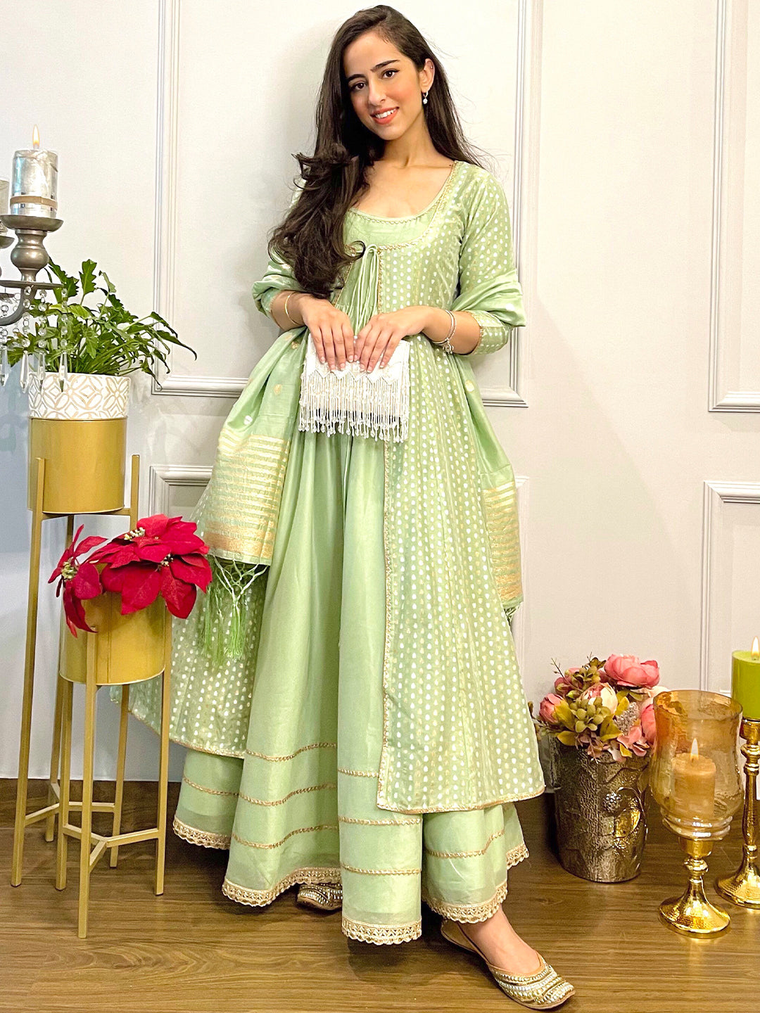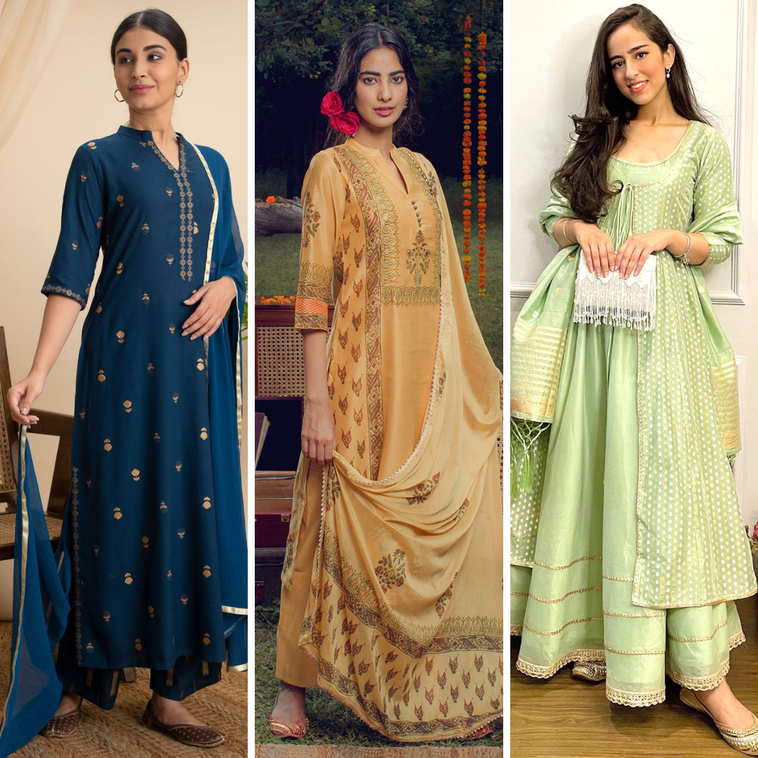 Light, bright, and full of life, this suit set will make a delightful addition to your wardrobe. Tailored with flowy silhouettes with classic golden prints, it is spruced up with a trendy fit.
