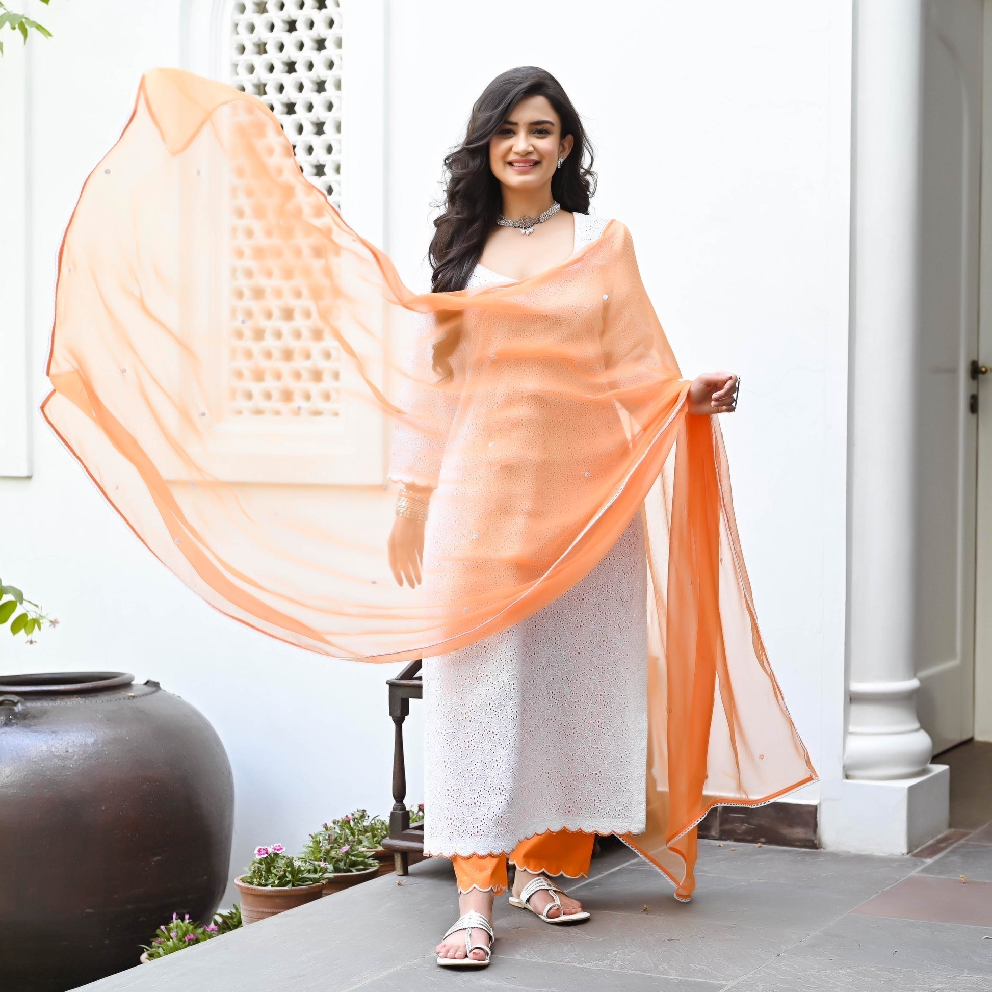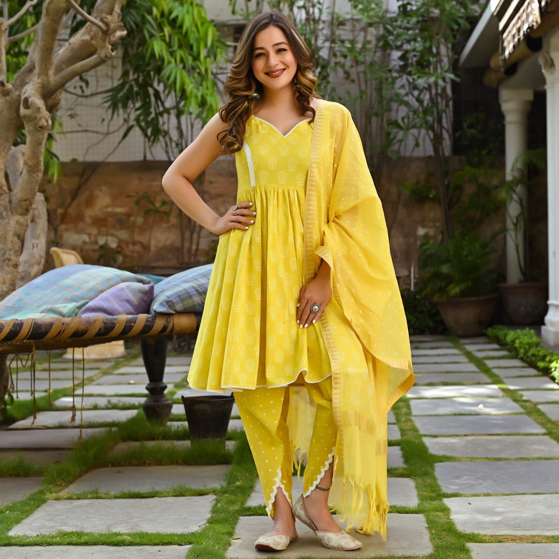 Light, bright, and full of life, this suit set will make a delightful addition to your wardrobe. Tailored with flowy silhouettes with classic golden prints, it is spruced up with a trendy fit.