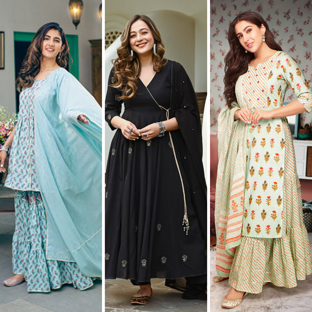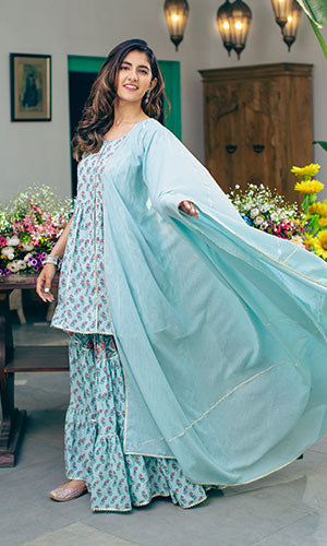 Light, bright, and full of life, this suit set will make a delightful addition to your wardrobe. Tailored with flowy silhouettes with classic golden prints, it is spruced up with a trendy fit.