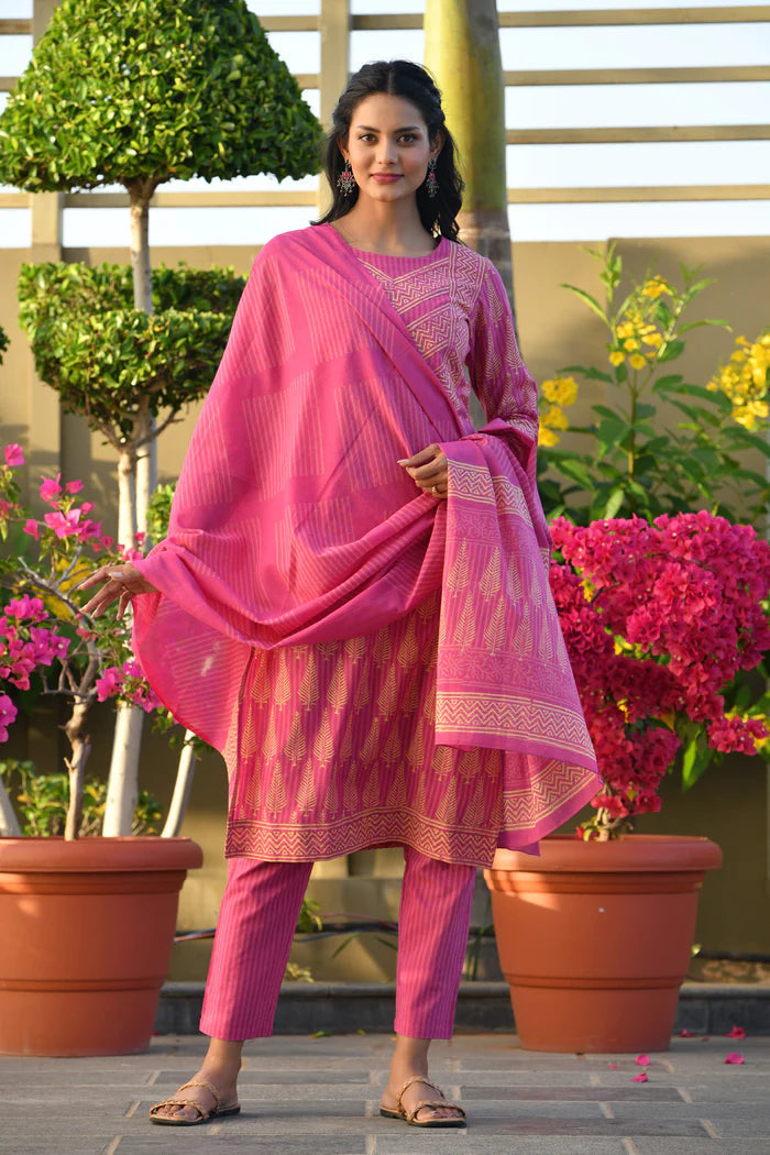 Light, bright, and full of life, this suit set will make a delightful addition to your wardrobe. Tailored with flowy silhouettes with classic golden prints, it is spruced up with a trendy fit.