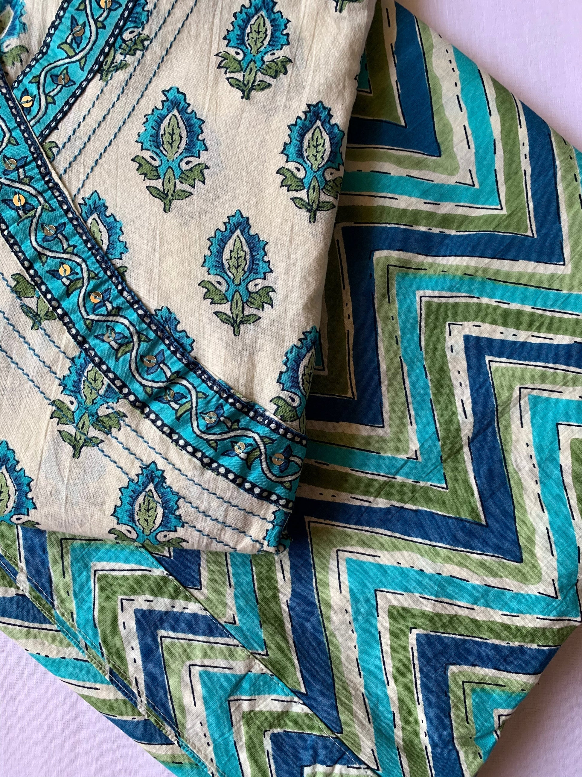 Firozi Boota Angrakha Cotton Kurta Set with dupatta - 3 pc