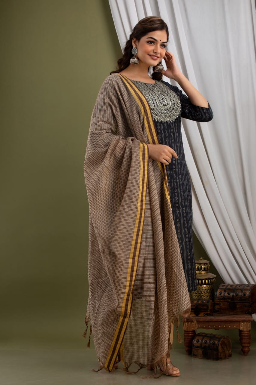 Designer handwoven kurti pant dupatta set with heavy dori adda sequin embroidery work on yoke.