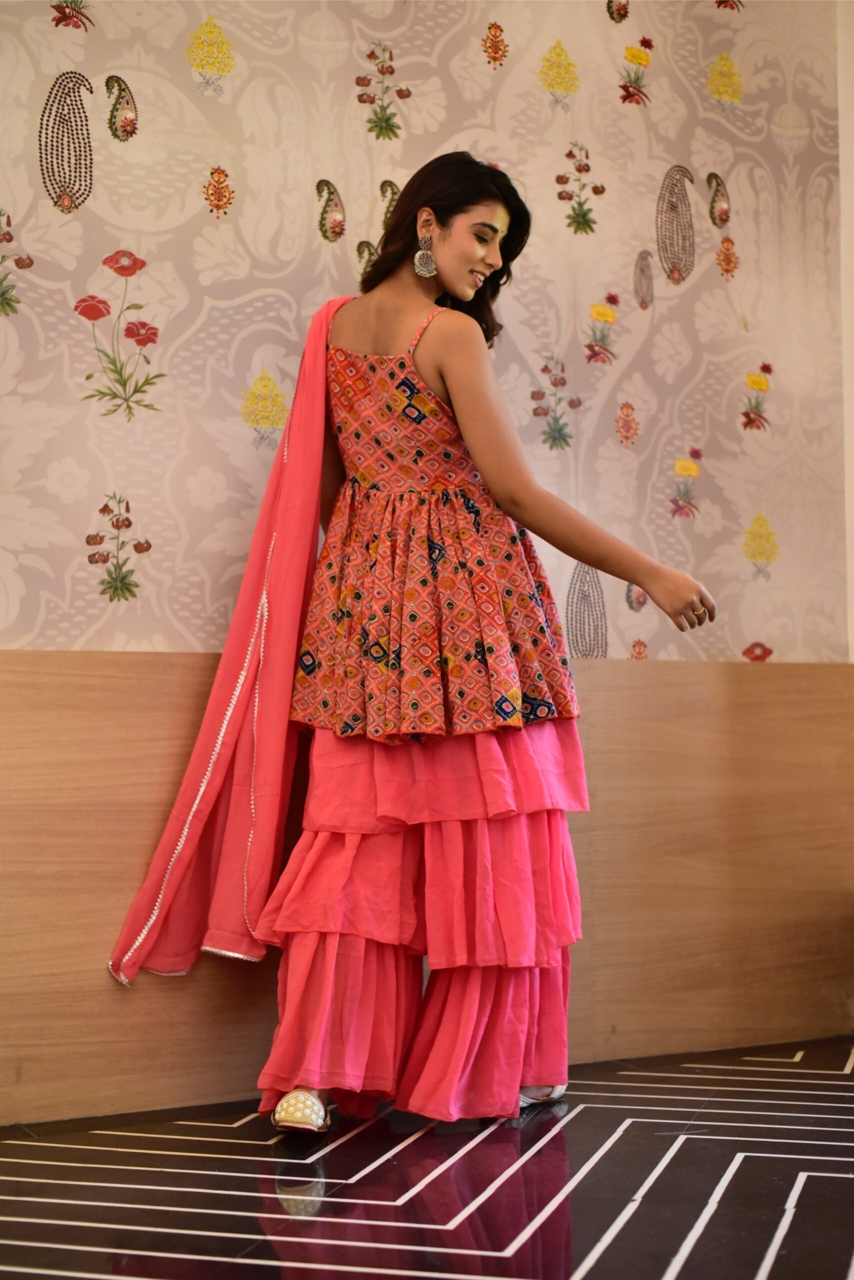 Do we even need to grab your attention to this authentic traditional printed flared kurta. with a chic layer patterned sharara and a sleek pretty dupatta.!