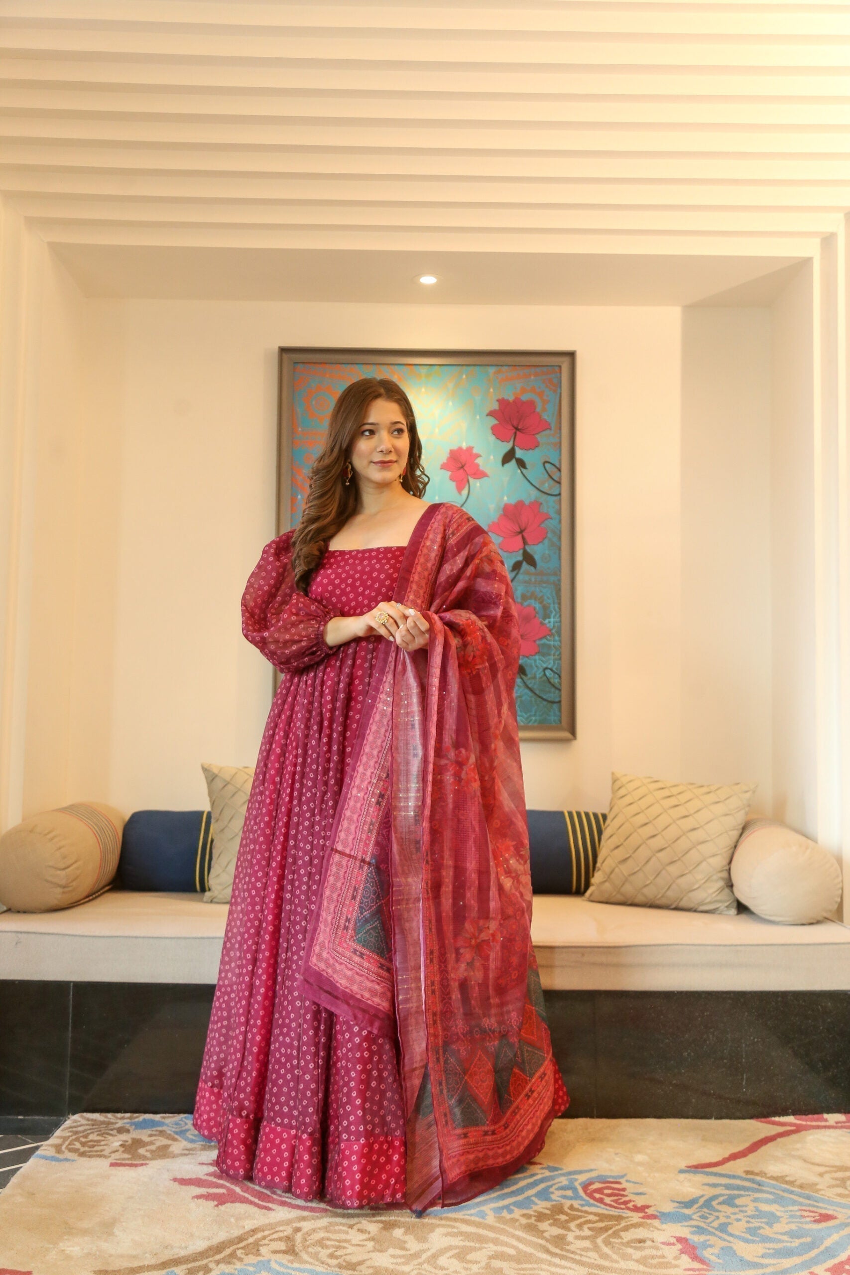 You’re beyond lovely, and here’s an outfit that makes you feel the beauty you behold! grab this flared bandhej printed maxi teamed with a dupatta from idaho’s new collection.!